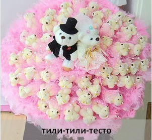 Содержимое: 41шт.плюшевые мишки, 2 шт.плюшевые мишки-мальчик и девочка, сетка-снег декоративная, пуховое боа, органза, лента атласная, основа для букета