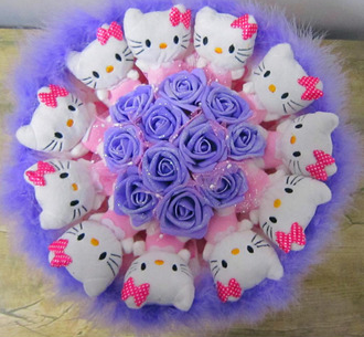 Состав: 11 роз латексных/атласных ручной работы, 11 плюшевых хэллоу китти, сетка-снег, перьевое боа, органза, гофрированная бумага, атласная лента